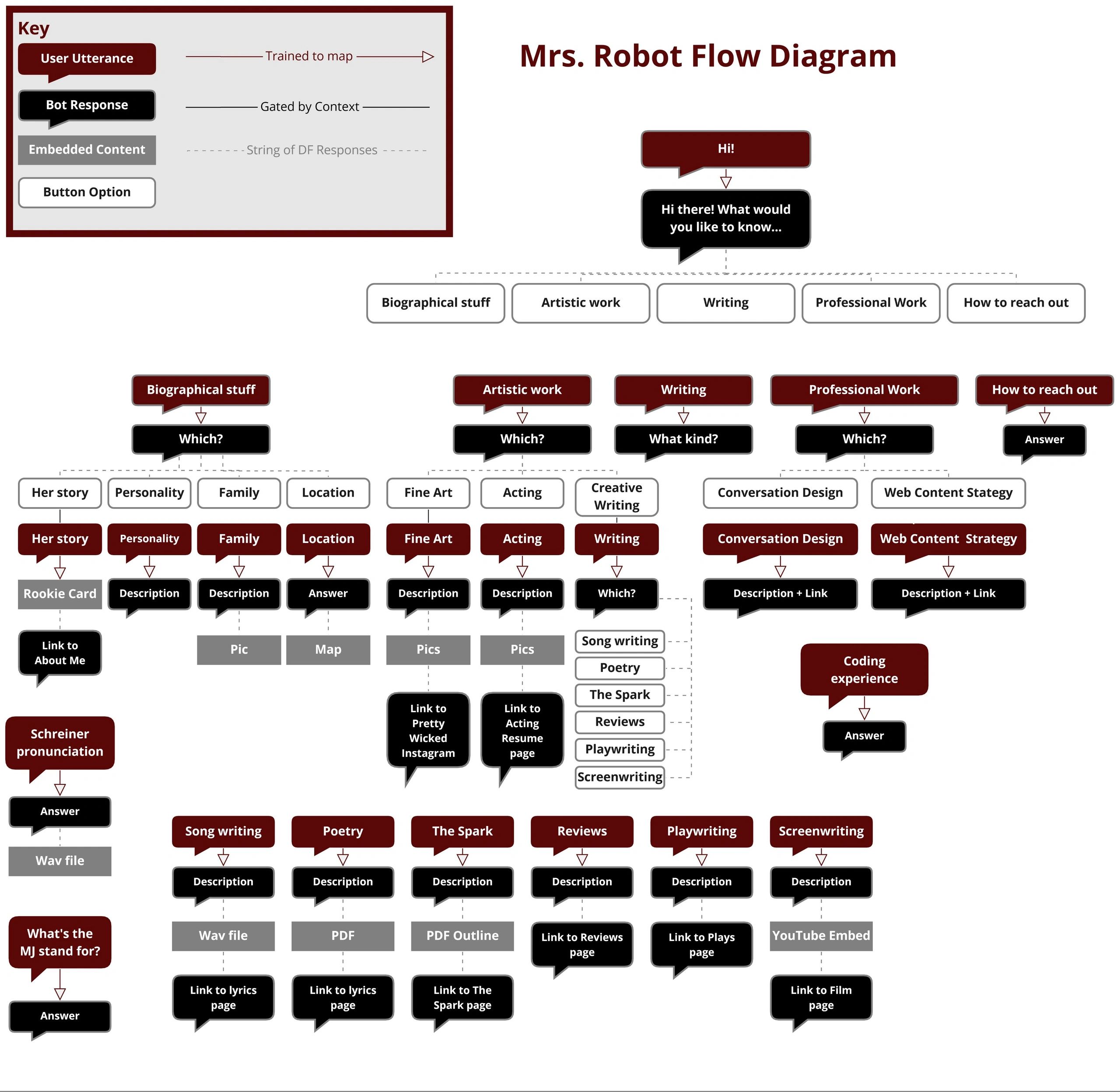 I've listed out the main branches of conversation I wanted to include here, but I always find that these maps are not comprehensive of the things people may want to chat with the bot about.